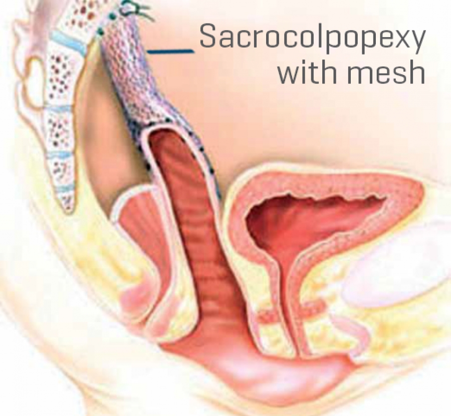 Sakrokolpo/ sakroservikopeksi : Karından gerçekleştirilen kesi veya laparoskopi ile uygulanabilir . rahim ağzı veya vajen kubbesi polipropilen meş ( yama ) ile sakrum olarak adlandırılan bel kemiği önündeki bağlara asılır. Oldukça etkili bir operasyondur, nüks oranları düşüktür. Kanama, komşu organ yaralanması, anesteziye bağlı komplikasyonlar, enfeksiyon riski taşımanın yanında sarkma düzeltildikten sonra idrar yolu üzerindeki baskı kalkacağı için bazı hastalarda idrar kaçırma şikayeti oluşabilir. Bunu engellemek amacı ile mesane boynuna destekleyici Burch sütürü konulabilir.